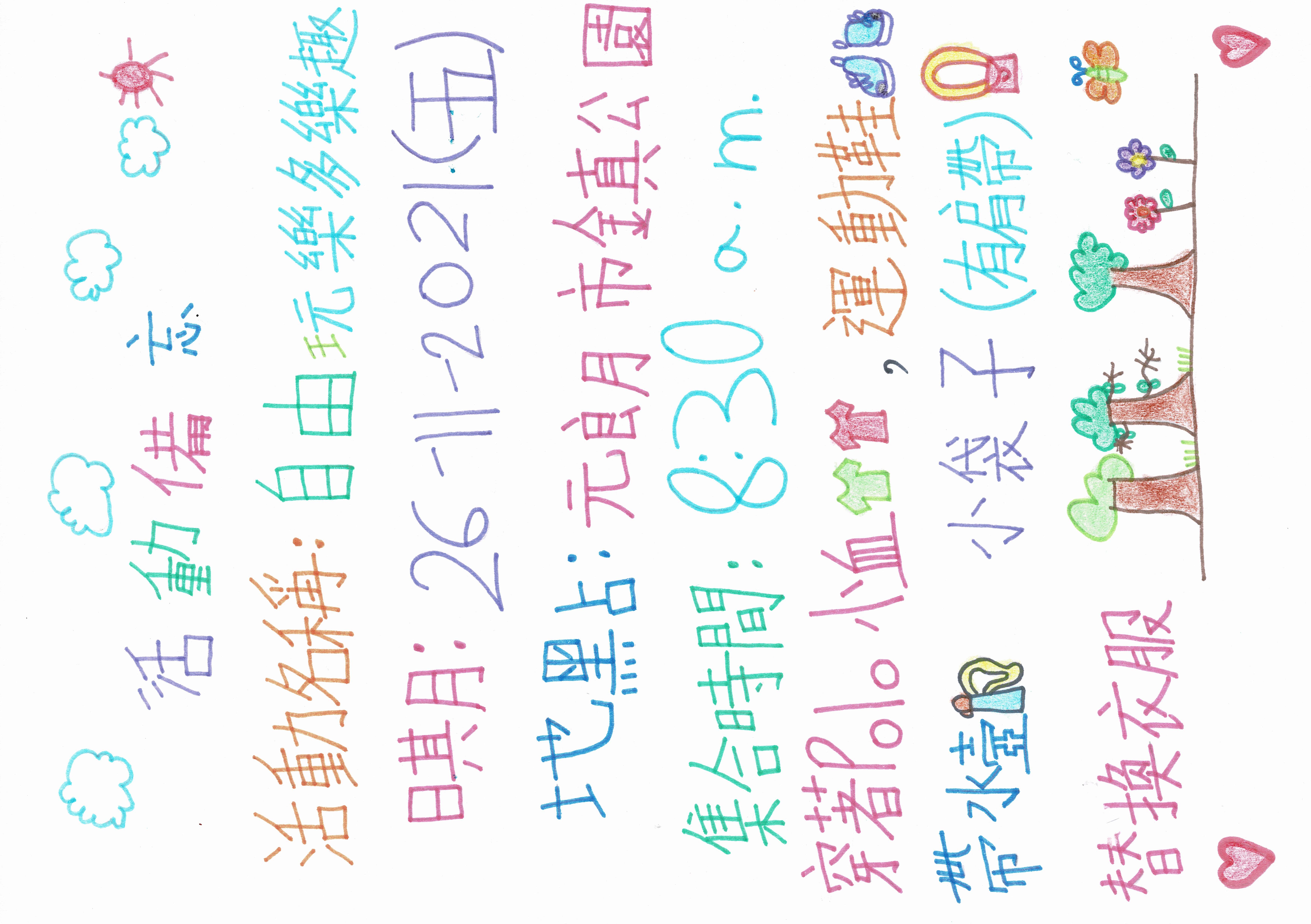 Our school orgnaises different types of parent-child activities every year, such as parent-child picnic, parent-child Christmas party, parent day, parent-child joint-school sports day, parent-child graduation day camp etc., to enhance communications and linkage between teachers and parents, parents and parents, parent and children, and to foster parent-child relationship.