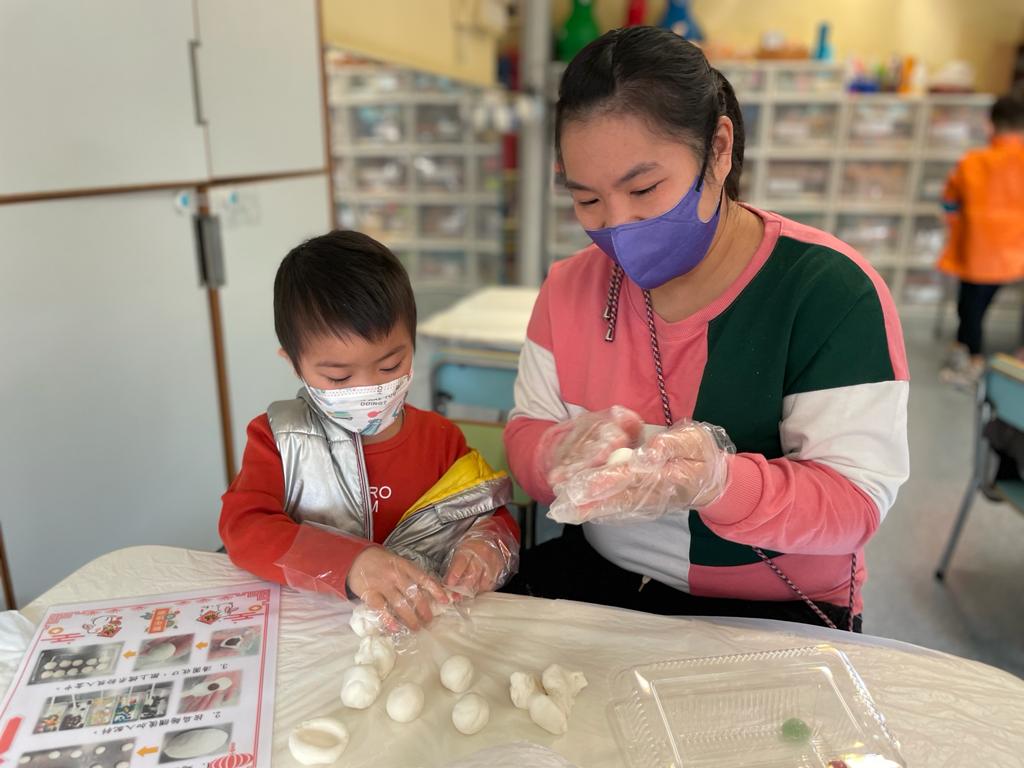 在農曆新年前,學校邀請了家長到校與幼兒一起製作揮春,用毛筆、墨硯書寫揮春,並一起用圖工材料裝飾揮春來佈罝家居;另外,家長與幼兒一起挑選材料製作中國傳統節慶食物:湯丸,回家後一起進食湯丸,感受中國傳統節慶的活動和氣氛。家長與幼兒也很投入和享受活動的過程和樂趣呢!